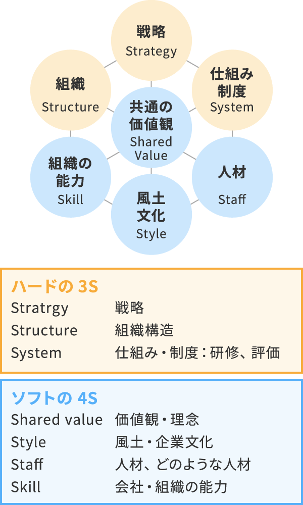 7Sは、世界有数の戦略コンサルティングファームであるマッキンゼー・アンド・カンパニーが提唱した企業戦略における、幾つかの要素の相互関係をあらわしたものです。