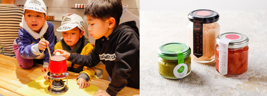 農家がこだわって作られた食材の味を活かし、手作り・無添加でお客様へお届けできるよう商品開発を徹底。また、新大阪には「手作り工房」を設け、子どもも大人も楽しくジャム作り体験をしながら、隠れフードロスについて学べる食育の場としています。